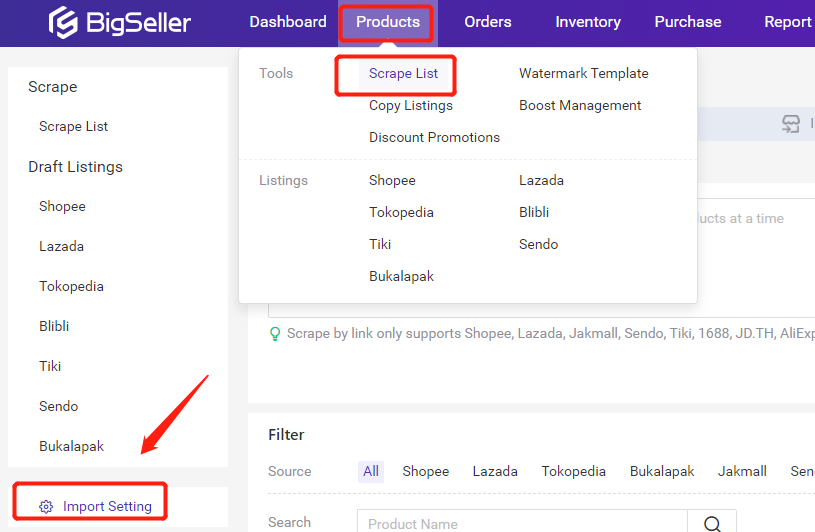 Products > Scrape List > Import Settings, select Shopee or Lazada to get started.