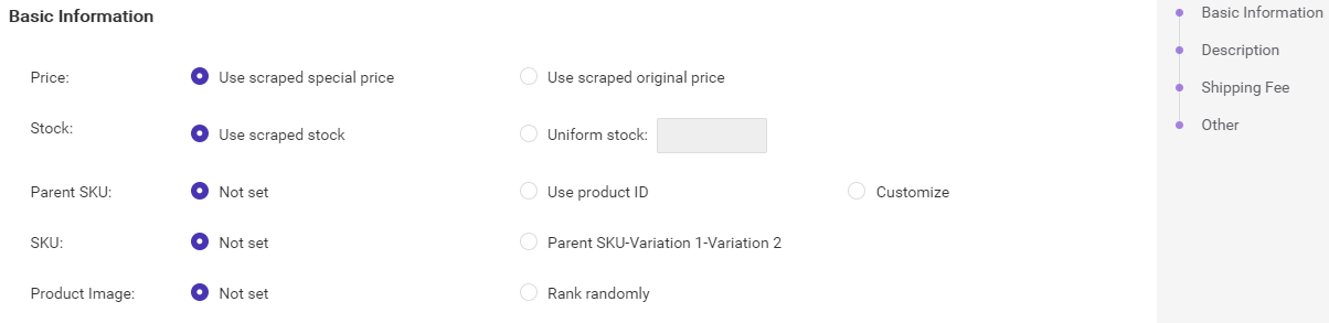 You can choose to use the scraped product's stock or newly set a Uniform stock. If you set a Uniform stock, when a product is imported to Draft, Bigseller will auto-fill in the Uniform stock for that product.
