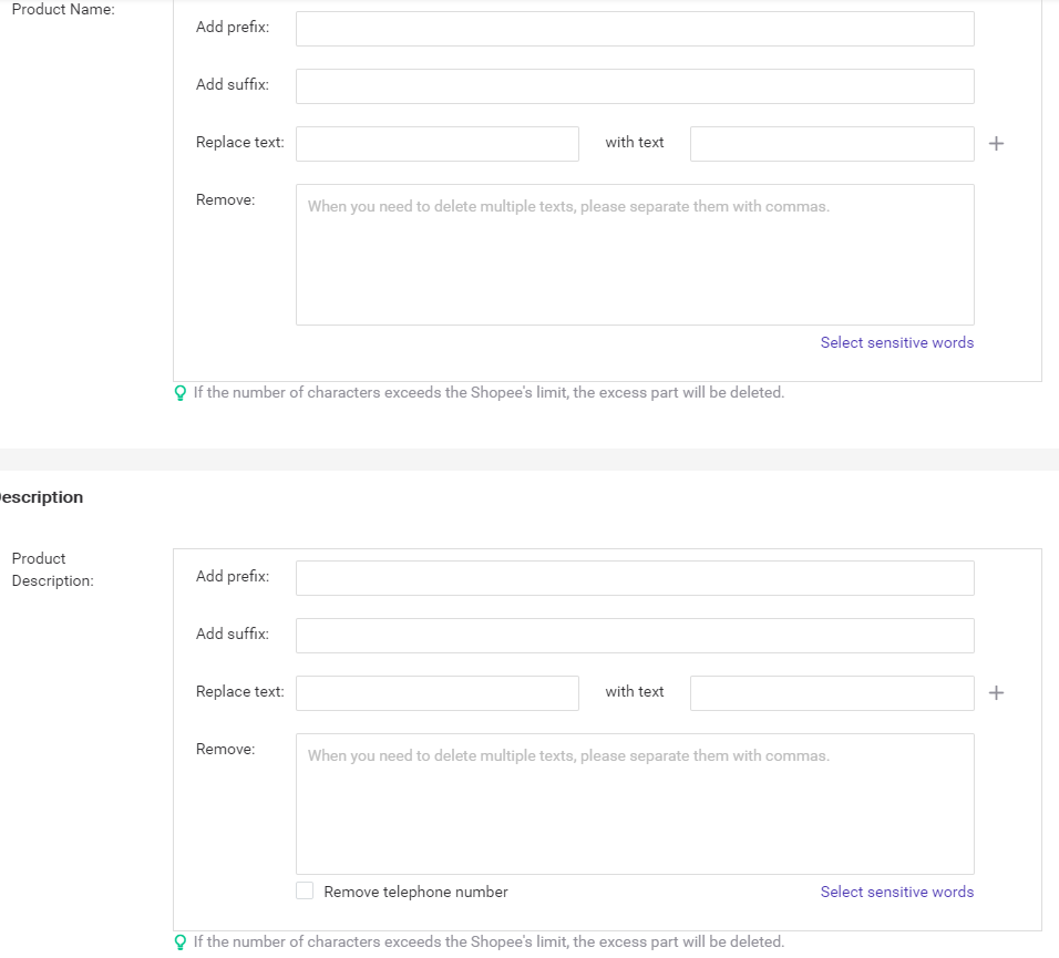 You can add prefix or suffix to your product name. You can also choose to replace A text with B text. A maximum of 5 texts can be replaced. You can also enter sensitive words here. So Bigseller will auto-remove them when detecting that your product name contains these words.